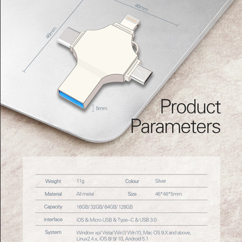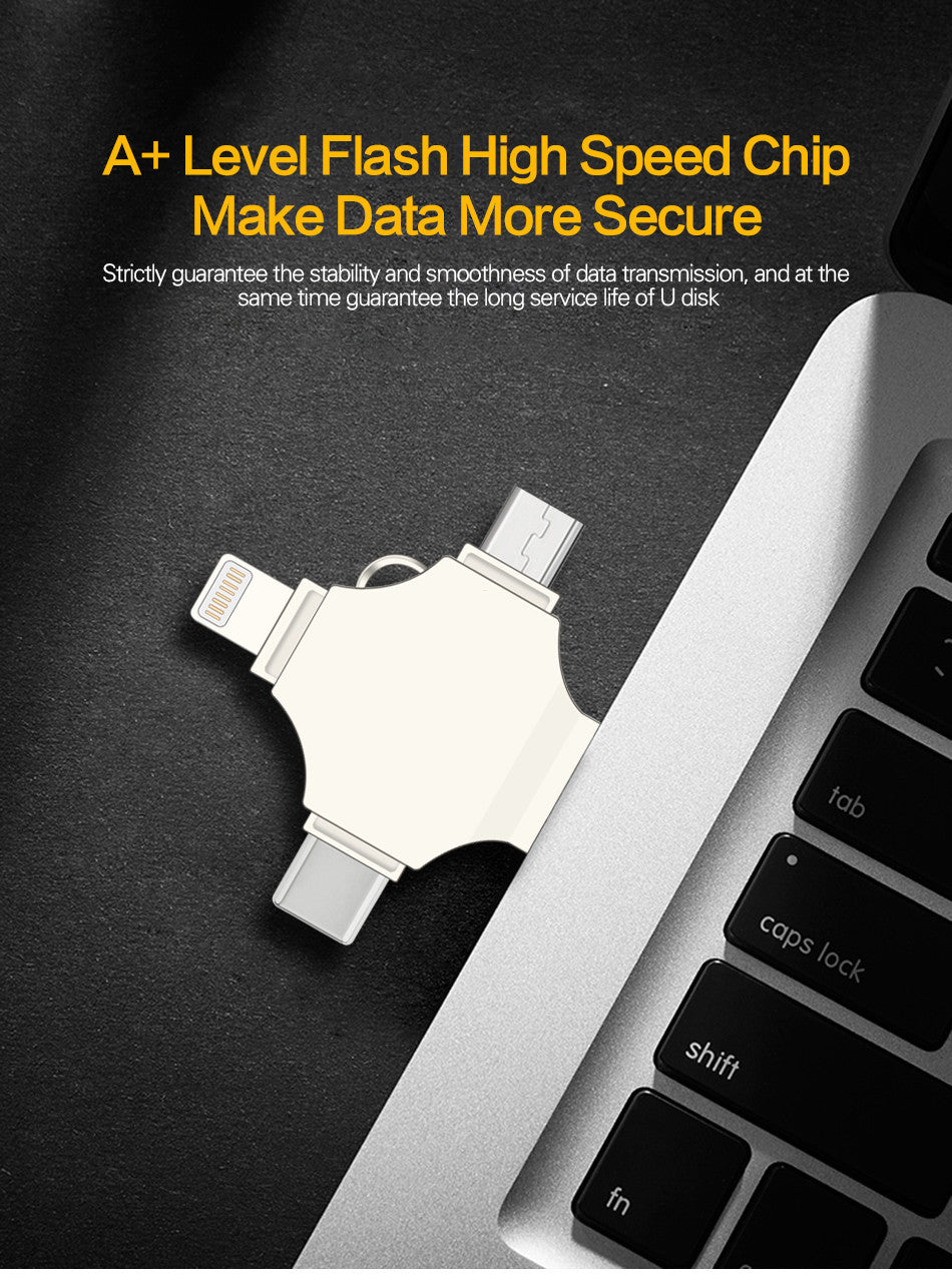 This 4-in-1 and stylish Metal USB Flash Drive is the perfect solution for easy and secure data storage across devices. With a sleek design and a variety of features, it ensures fast and reliable performance for all your storage needs.