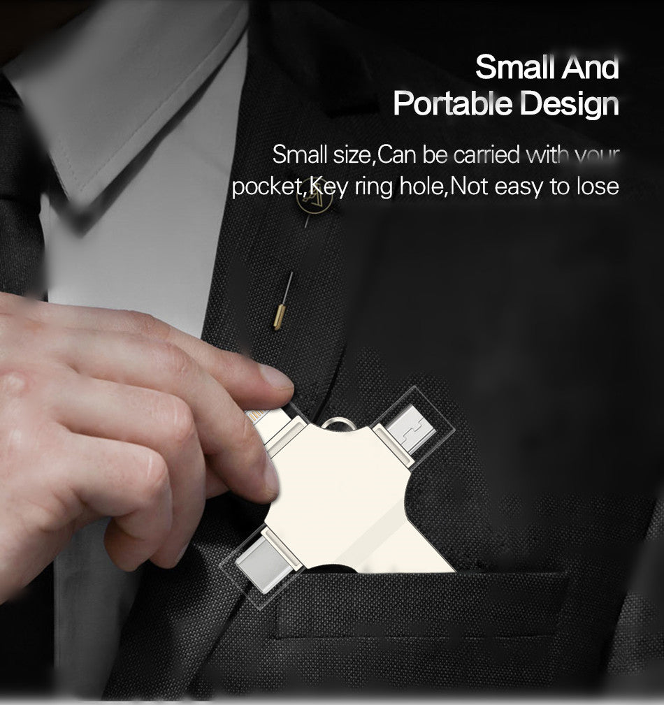 - 4-in-1 Interface: Compatible with iOS, Micro USB, Type-C, and USB ports, allowing seamless data transfer between mobile devices and computers.